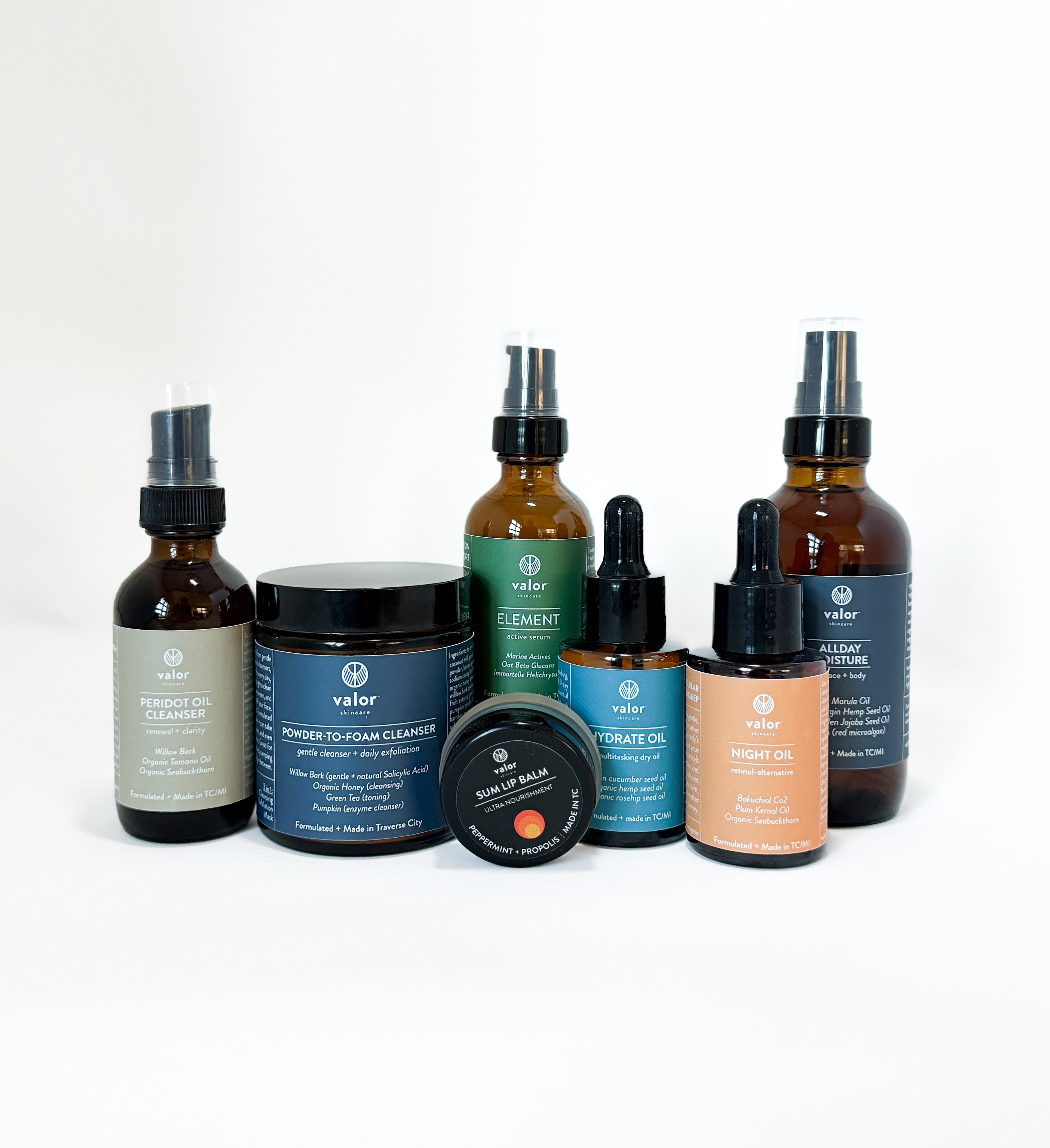 Peridot Cleanser Oil: virgin + grown in Oregon hemp seed oil*, camellia seed oil*, meadowfoam seed oil, tamanu oil, [lemon balm, nettles, and oatstraw extracted in organic golden jojoba seed oil*], castor oil*, [calendula extracted in organic sunflower oil], pumpkin seed oil*, helianthus annuus (sunflower) seed oil & lactobacillus/salix alba(willow) bark ferment filtrate, sambucus nigra fruit extract, sea buckthorn oil*, rosemary antioxidant, wildcrafted mugwort essential oil*, rosewood leaf essential oil, and wild-crafted hinoki essential oil.